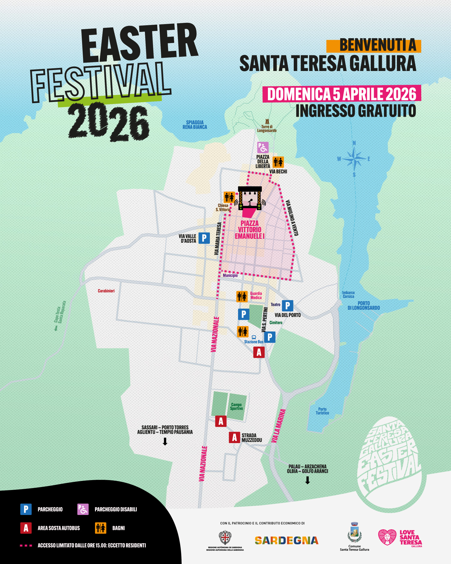- Parcheggi: Vi invitiamo a visionare la mappa ufficiale per individuare i parcheggi consigliati. Vedi la mappa Easter-Festival-Mappa