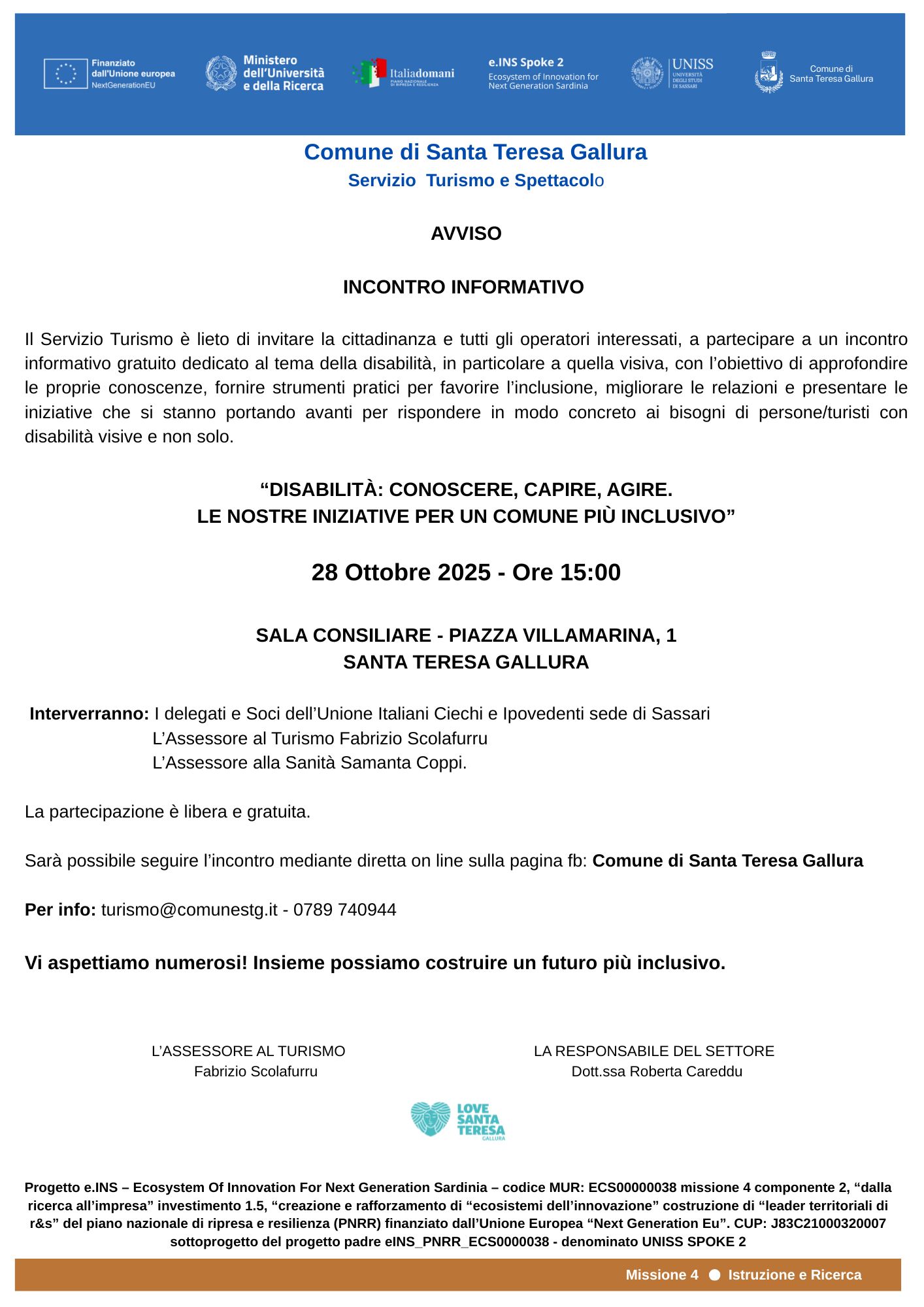 Il Servizio Turismo del Comune di Santa Teresa Gallura invita la cittadinanza e tutti gli operatori interessati a partecipare all’incontro informativo gratuito dedicato al tema della disabilità, con particolare attenzione alla disabilità visiva.
