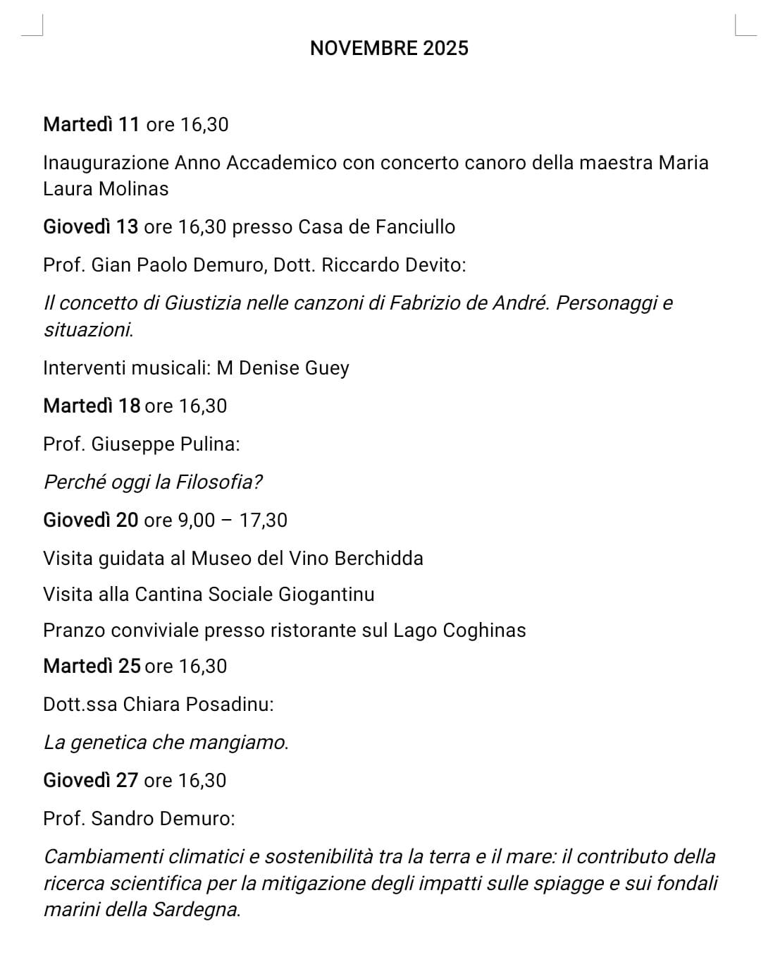 Sono previste due lezioni settimanali, martedì e giovedì, dall'11 Novembre 2025 a Maggio 2026 , di area umanistica, scientifica, economica e di attualità - Corsi collaterali di Inglese, Informatica e altri rispondenti alle richieste dei Soci- Viaggi d’istruzione in Italia e all’estero, escursioni in Sardegna finalizzate alla conoscenza del patrimonio culturale, ambientale, artigianale, etc.